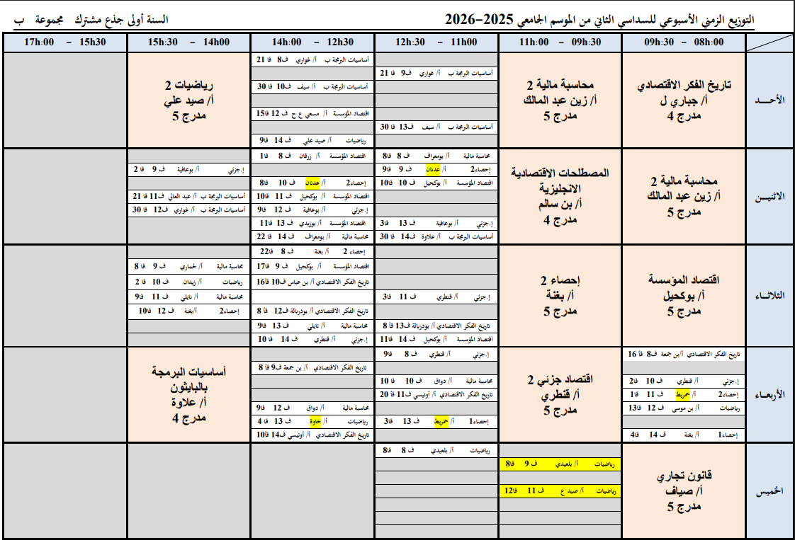 Weekly timetable for the second semester of the 2025-2026 academic year, first year, common core, group B