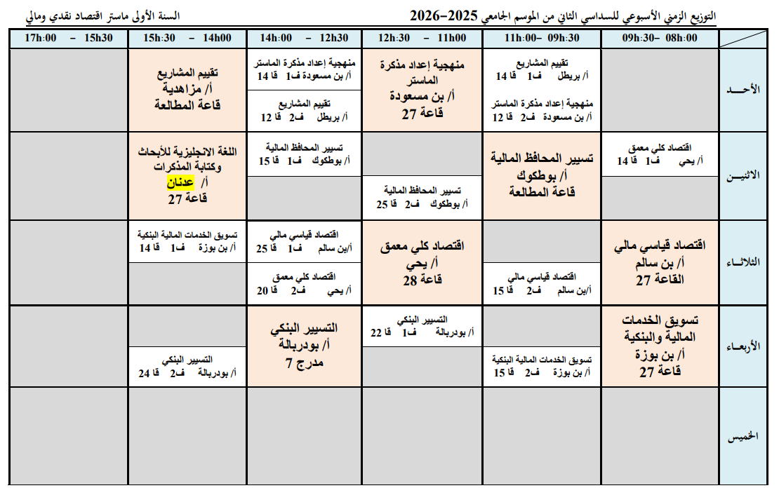 Weekly Timetable for the First Semester of the Academic Year 2025–2026 – First Year Master’s in Monetary and Financial Economics