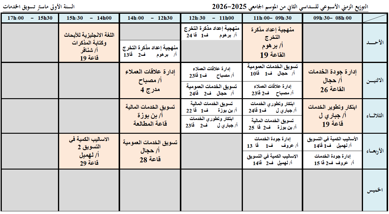 Weekly Timetable for the First Semester of the Academic Year 2025–2026 – First Year Master’s in Services Marketing