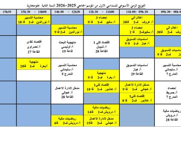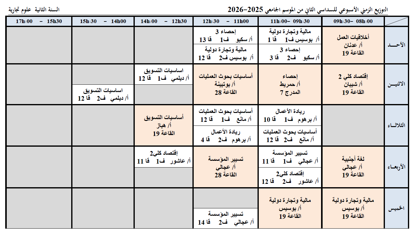 Weekly Timetable for the First Semester of the Academic Year 2025–2026 – Second Year in Commercial Sciences Activities