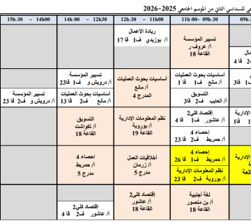 Weekly Timetable for the First Semester of the Academic Year 2025–2026 – Second Year in Management Sciences Activities