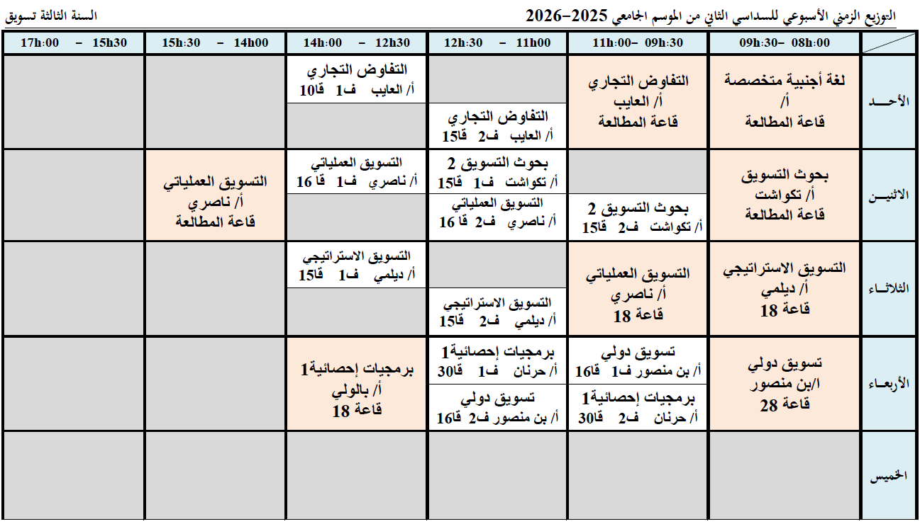 Weekly Timetable for the First Semester of the Academic Year 2025–2026 – Third Year in Marketing Activities