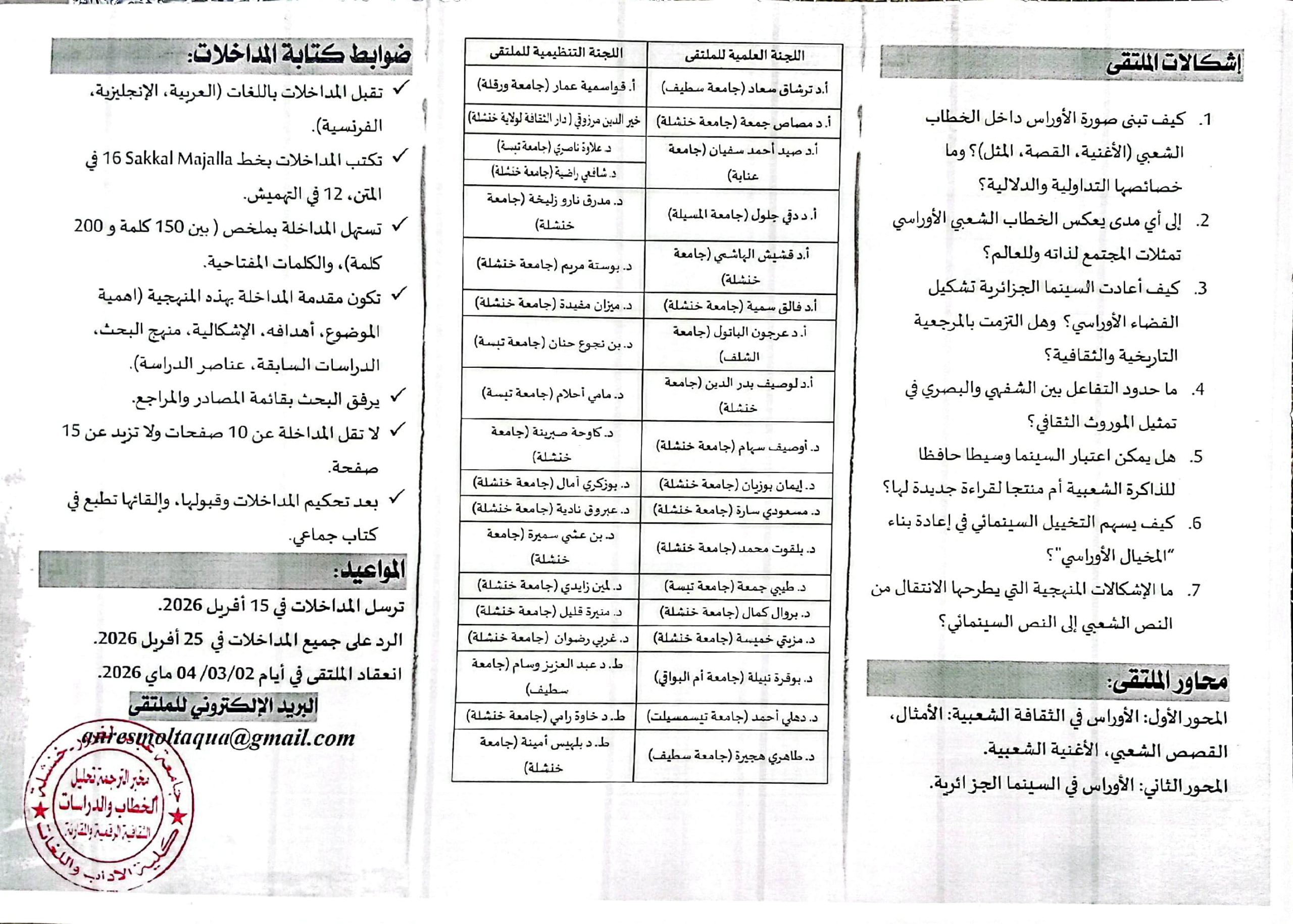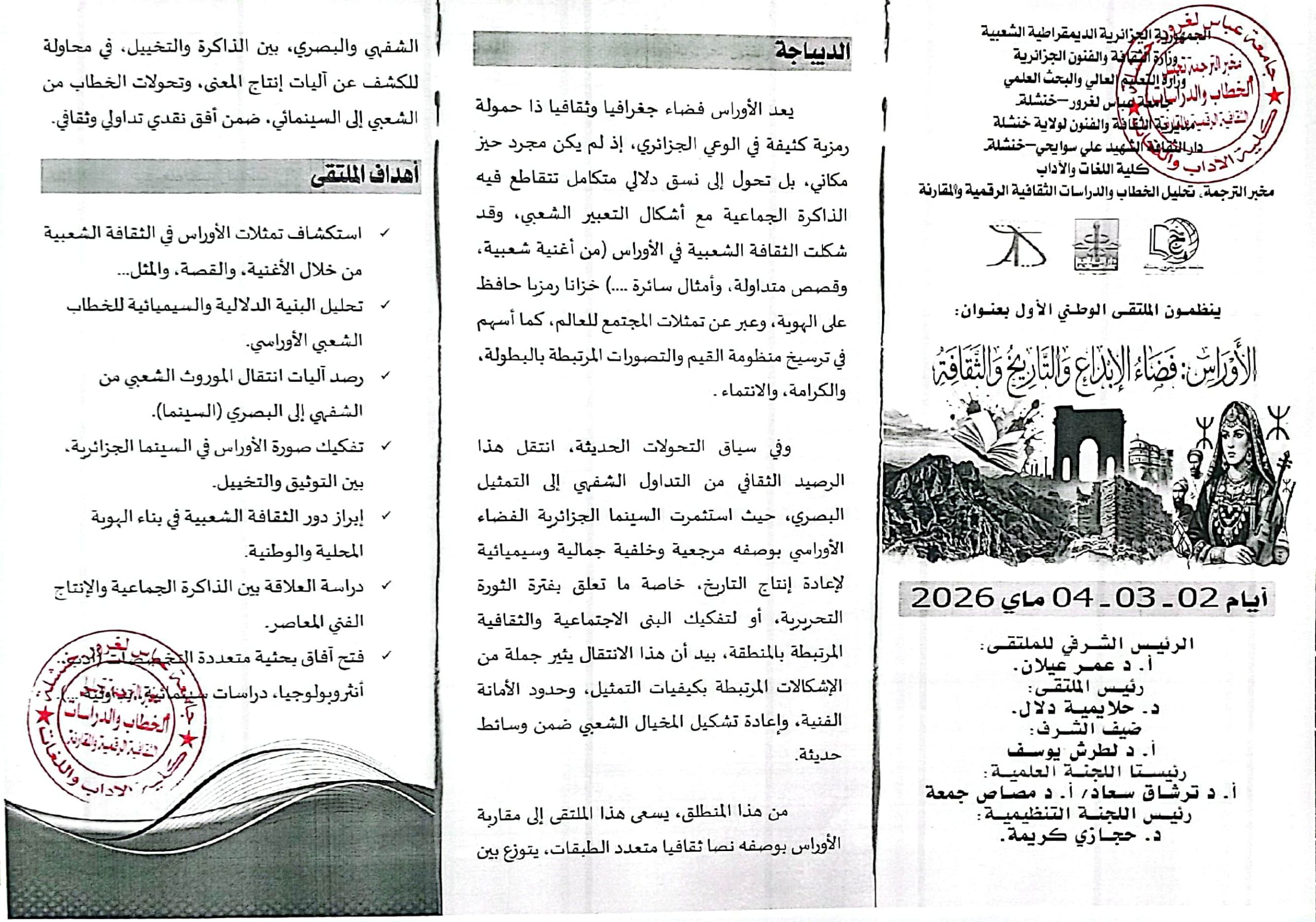 ملتقى الأوراس فضاء الابداع والتاريخ والثقافة، تنظيم دار الثقافة لولاية خنشلة بالاشتراك مع مخبر الترجمة وتحليل الخطاب