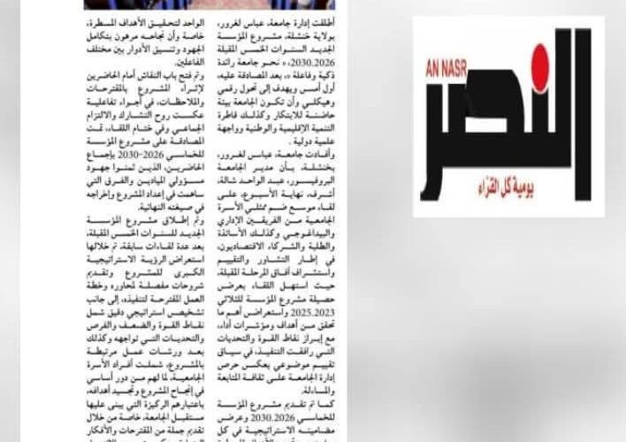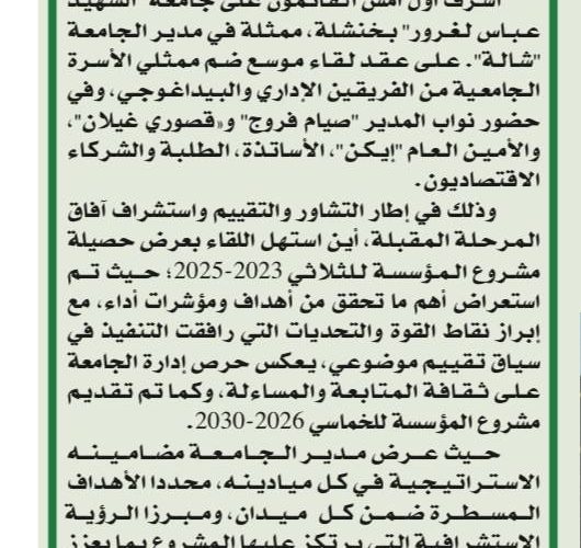 Extraits des activités de la réunion élargie supervisée par le directeur de l’Université Abbes Laghrour Khenchela, le professeur Abdelwahed Challa, consacrée à la présentation du plan quinquennal de l’établissement pour 2026-2030.