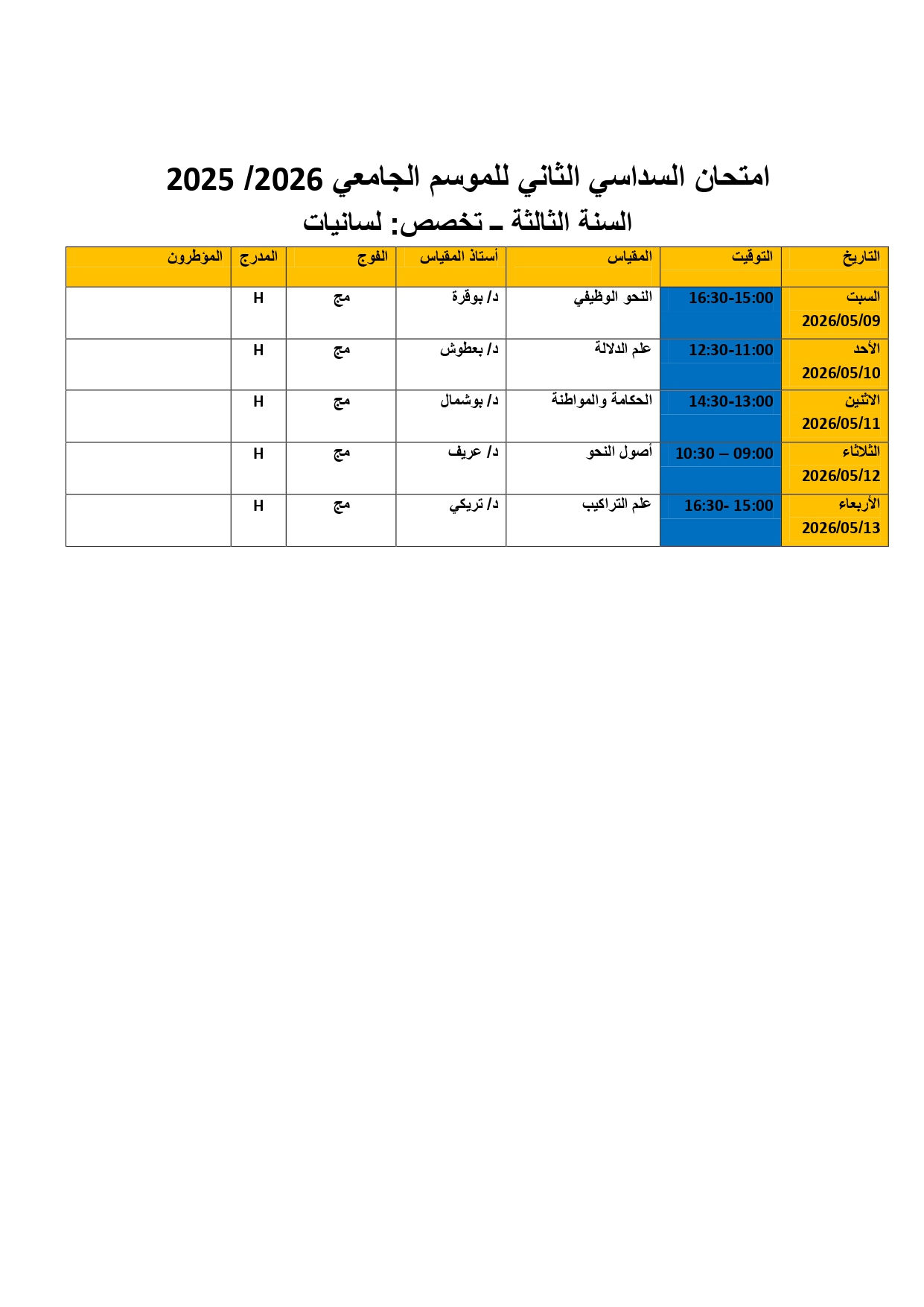 Calendrier des examens du Département de langue et littérature arabes -L3 Ling