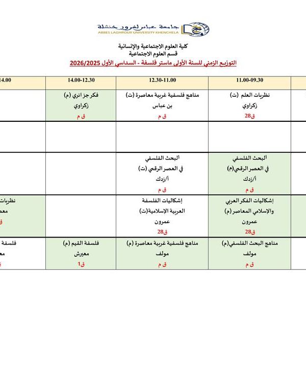 Répartition temporelle du département Sciences Sociales M2 Philosophieكلية العلوم الاجتماعية والإنسانية2025-10-08