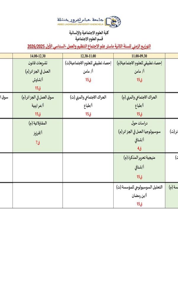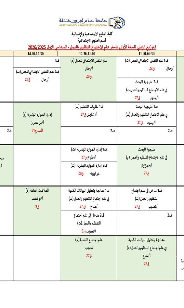 Répartition temporelle des sciences sociales Département M1 Sociologie Organisation et travailكلية العلوم الاجتماعية والإنسانية2025-10-08