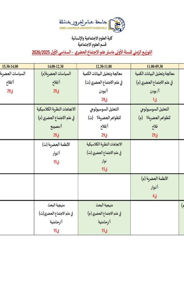 Répartition temporelle des sciences sociales Département M1 Sociologie urbaineكلية العلوم الاجتماعية والإنسانية2025-10-08