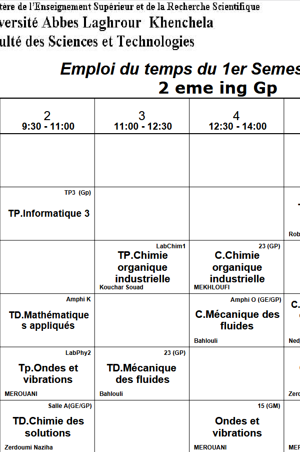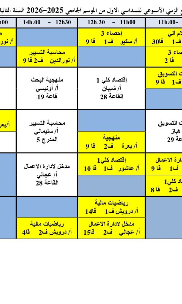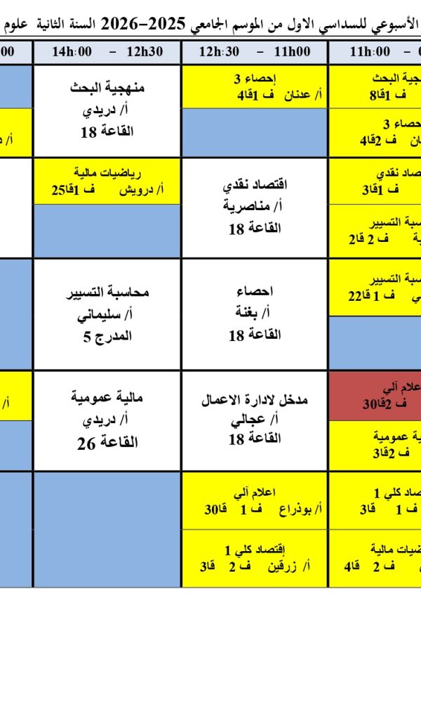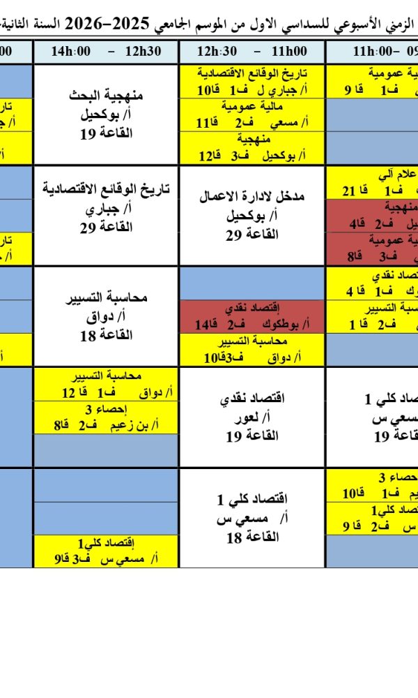 Emploi du temps hebdomadaire du premier semestre de l’année universitaire 2025–2026 – Deuxième année Sciences Économiquesكلية العلوم الاقتصادية, التجارية و علوم التسيير2025-10-08
