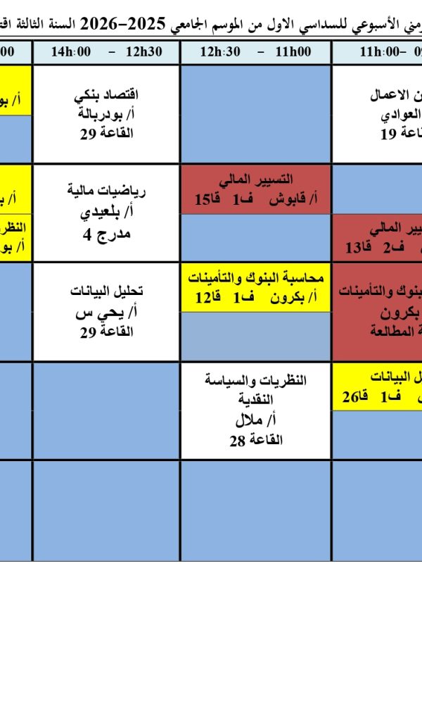 Emploi du temps hebdomadaire du premier semestre de l’année universitaire 2025–2026 – Troisième année Économie Monétaire et Financièreكلية العلوم الاقتصادية, التجارية و علوم التسيير2025-10-08