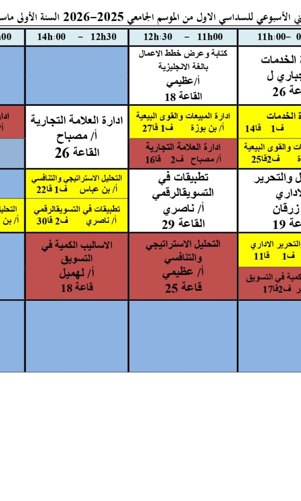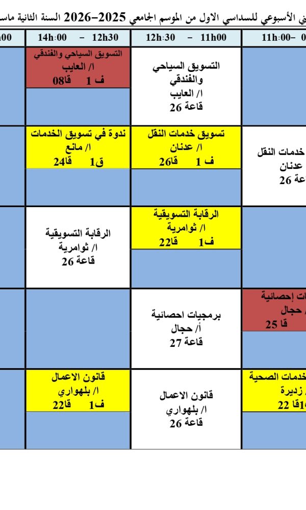Emploi du temps hebdomadaire du premier semestre de l’année universitaire 2025–2026 – Première année Master Marketing des Servicesكلية العلوم الاقتصادية, التجارية و علوم التسيير2025-10-08