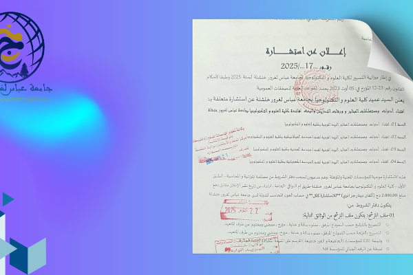 Résumé des étapes requises : Choix des sujets : Chaque étudiant doit choisir 10 sujets pour son Projet de Fin d’Études (PFE). Classement des vœux : Vous devez classer ces dix sujets par ordre de préférence (du plus souhaité au moins souhaité). Remplir le formulaire : Téléchargez le formulaire de choix de sujets (“استمارة اختيار المواضيع”), et remplissez-le avec vos informations et vos sujets classés. Date limite de dépôt : Le 24 octobre 2025. Méthode d’envoi : Envoyez le formulaire dûment rempli par e-mail à l’adresse suivante : r_mahalaine@univ-khenchela.dz Liens et fichiers importants : Liste des sujets de PFE : Remarque : Le document intitulé “محضر 07-05-2025” semble être un procès-verbal administratif du département et n’est pas nécessaire à l’étudiant pour la procédure de choix des sujets. Conseil : N’attendez pas le dernier jour et envoyez vos vœux dès que possible....اقرأ أكثر