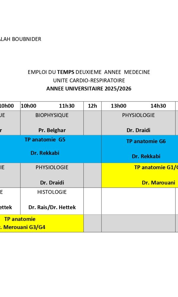 Il est porté à la connaissance des étudiants de deuxième année Sciences Médicales que l’examen du module Système cardio-respiratoire aura lieu le dimanche 02 novembre 2025 à 11h30....اقرأ أكثر