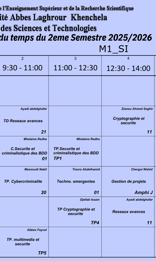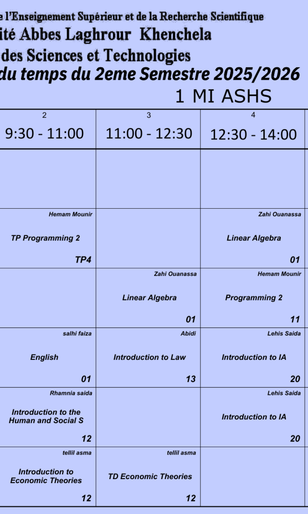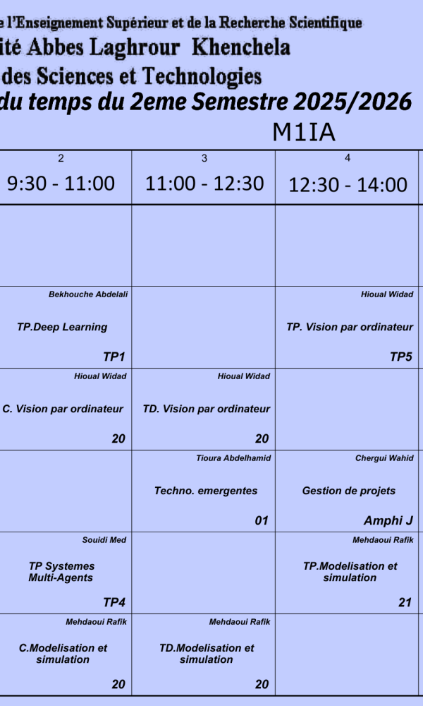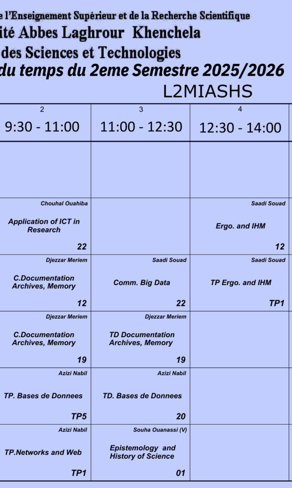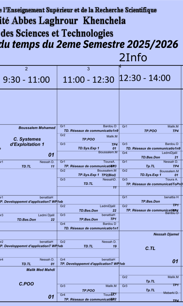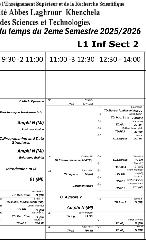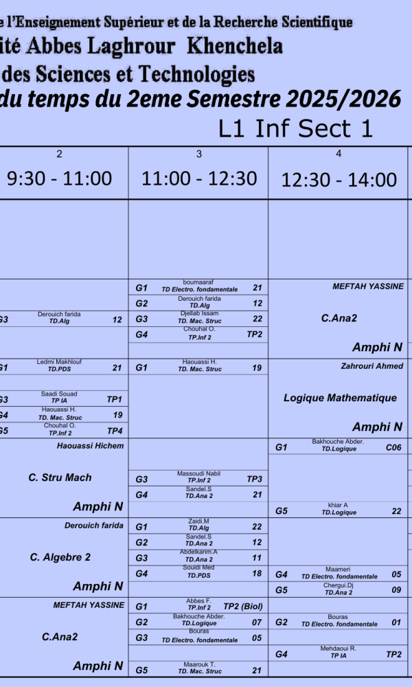Convocation des étudiantsNous informons les étudiants dont les noms suivent : – Zardoum Marwa, G3– Bouteraa Ines, G1– Sebaa Khadija,G1– Boussalem Amine, G3 qu’ils doivent se présenter à Mme Garoui Samira demain lundi 09 février 2029 vers huit heures du matin dans l’amphithéâtre I....اقرأ أكثر