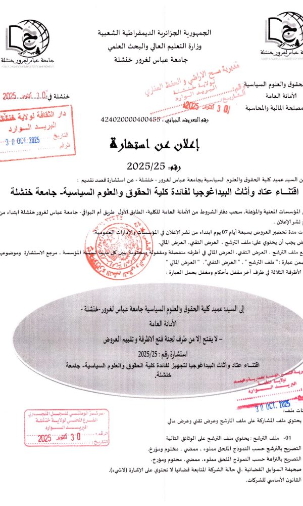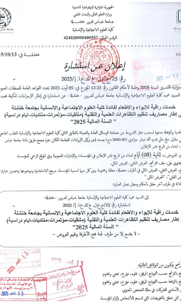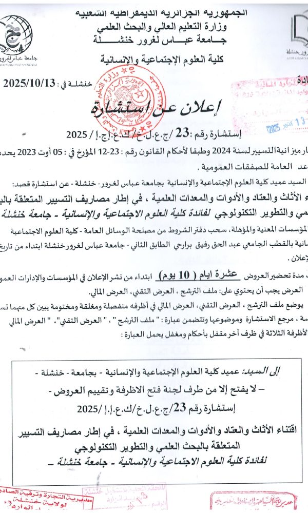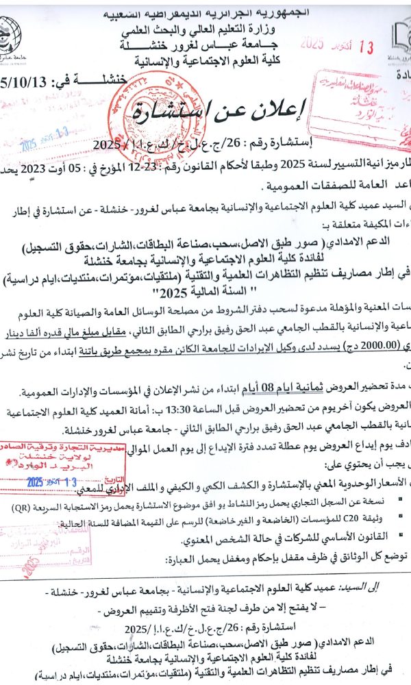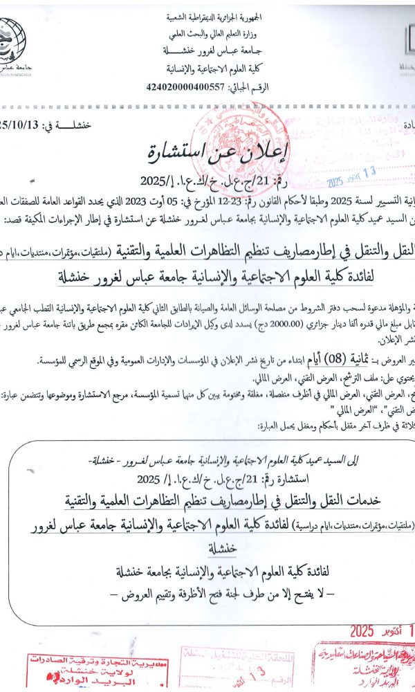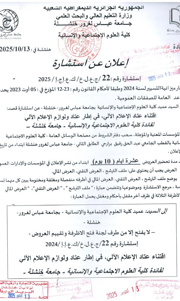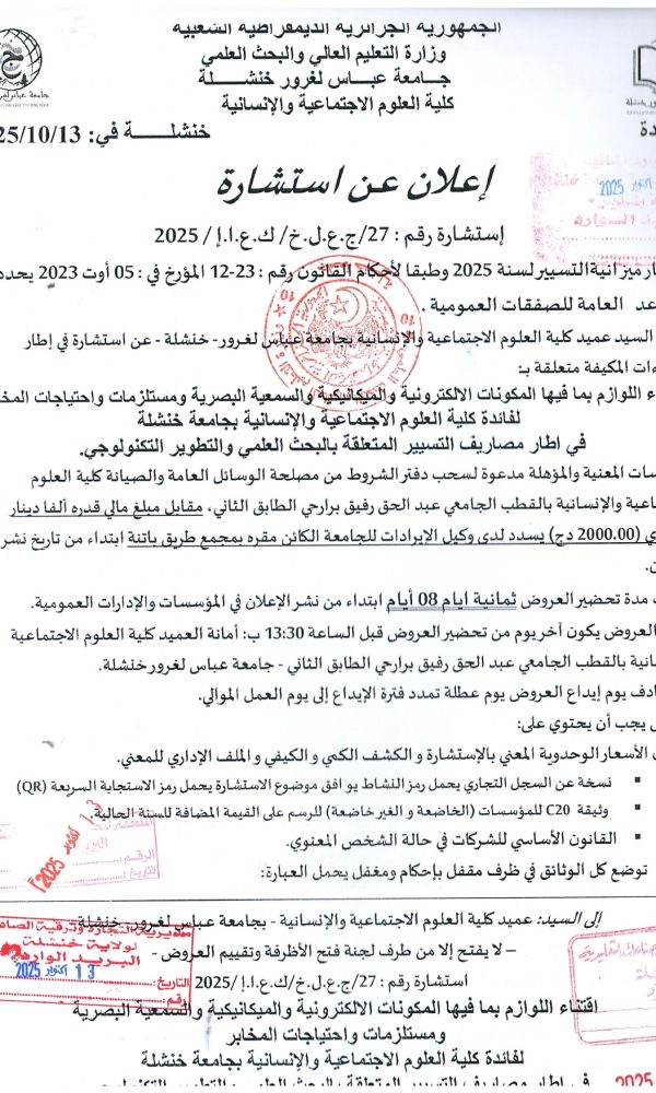 Annonce d’annulation de la procédure : Consultation 21-2025كلية الحقوق والعلوم السياسية2025-10-29كلية...اقرأ أكثر