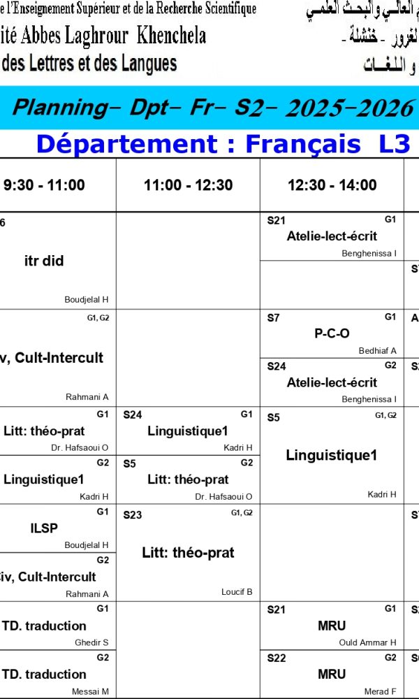 Rappel de l’existence de la plateforme de distribution horaire sur l’espace étudiant التوزيع الزمني لقسم اللغة والأدب العربي – جامعة عباس لغرور خنشلة التوزيع الزمني لقسم الآداب واللغة الفرنسية – جامعة عباس لغرور خنشلة التوزيع الزمني لقسم الآداب و اللغة الانجليزية – جامعة عباس لغرور خنشلة وفقكم الله...اقرأ أكثر