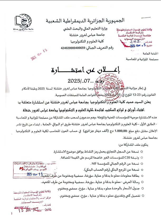 Consultation N° 07 : Acquisition de papiers et fournitures de bureau au profit de la Faculté des Sciences et Technologies