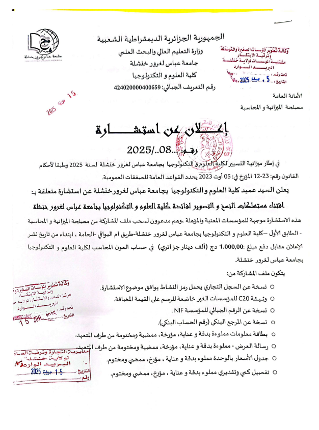 Consultation N° 07 : Acquisition de papiers et fournitures de bureau au profit de la Faculté des Sciences et Technologies