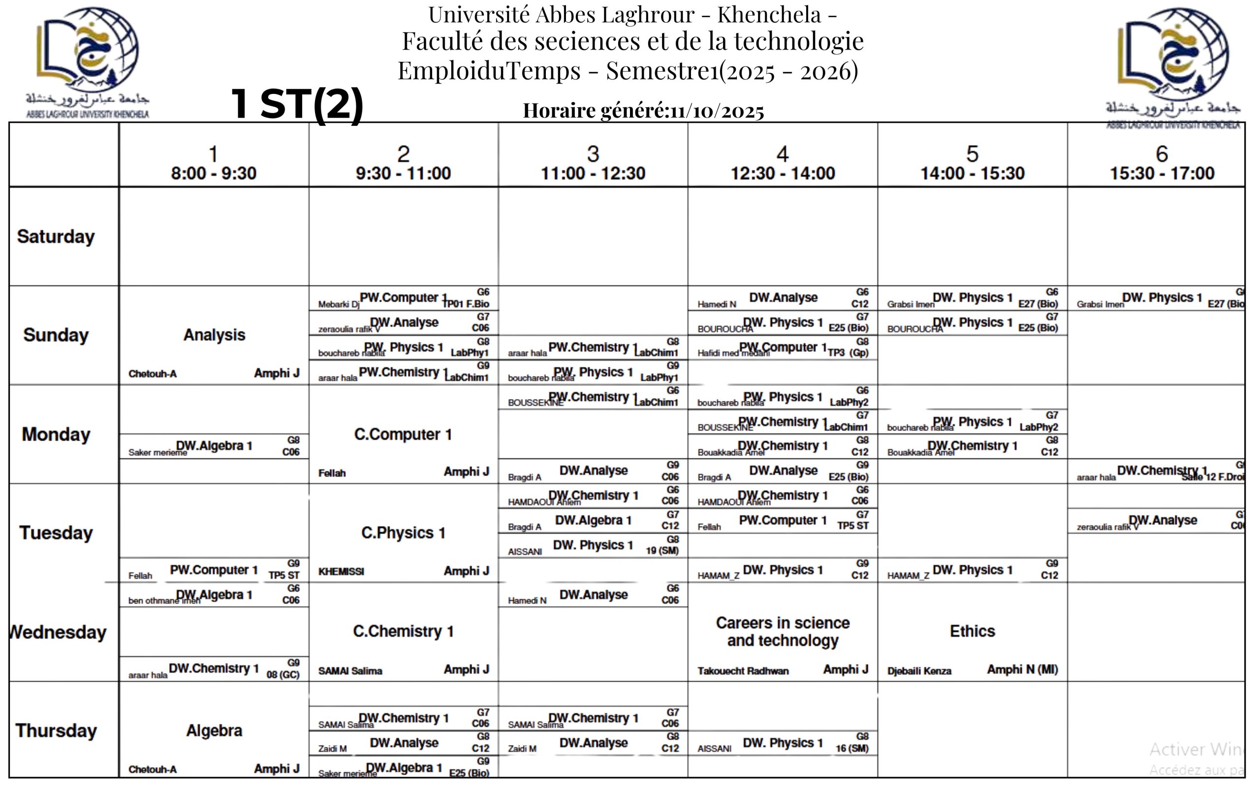 Emploi du temps du Département des Sciences et de la Technologie