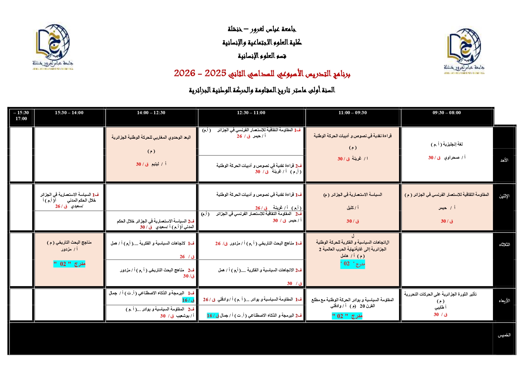 Emploi du temps du département des sciences humaines – M1 : Histoire de la résistance et du mouvement national