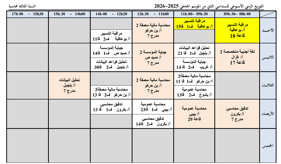 Emploi du temps hebdomadaire du deuxième semestre de l’année universitaire 2025-2026, comptabilité de troisième année publicités