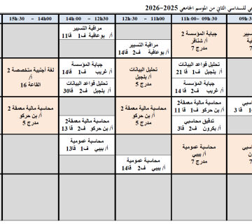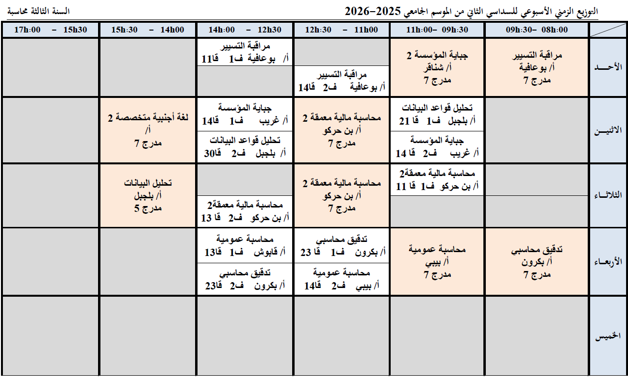 Emploi du temps hebdomadaire du deuxième semestre de l’année universitaire 2025-2026, comptabilité de troisième année