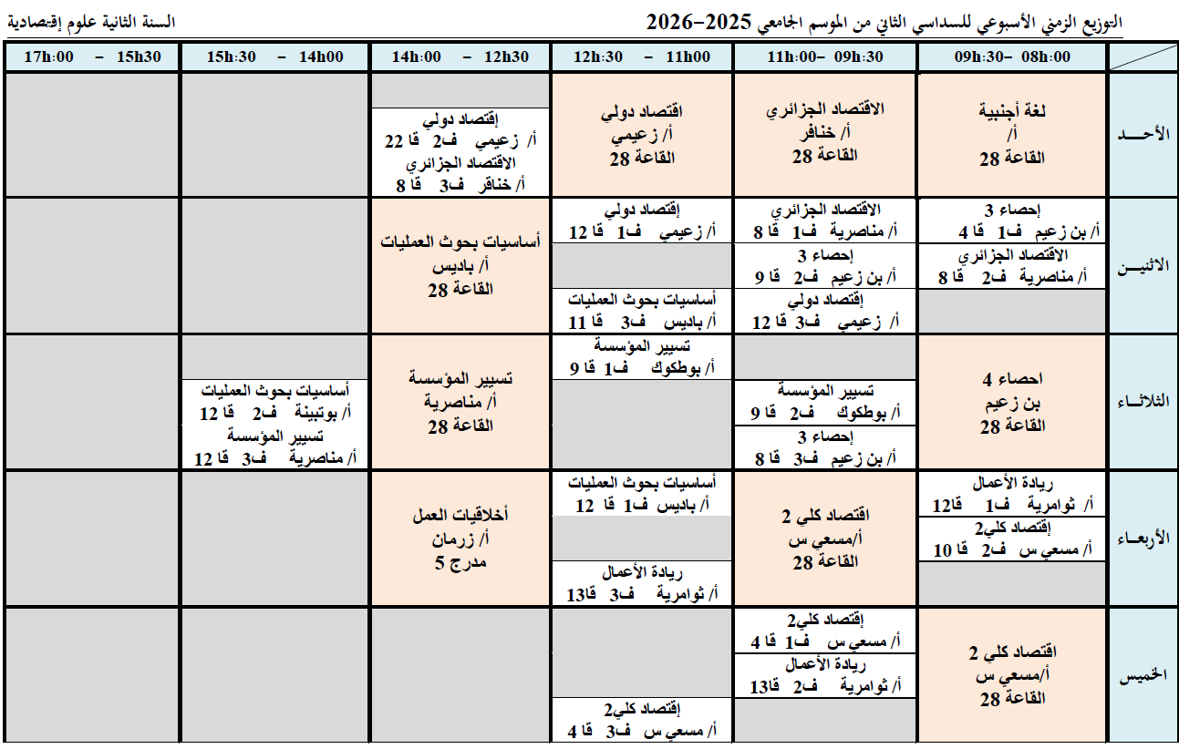 Emploi du temps hebdomadaire du deuxième semestre de l’année universitaire 2025-2026, deuxième année, Économie