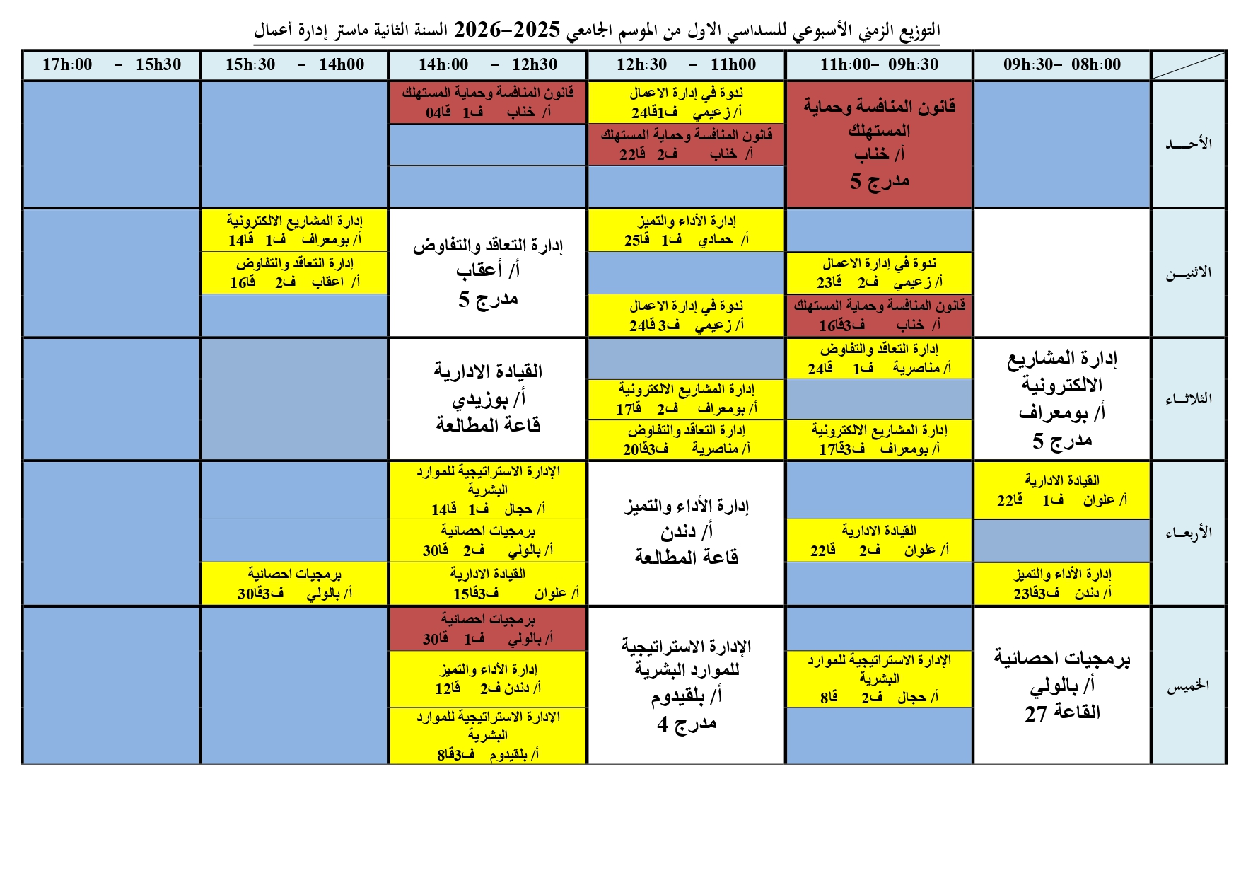 Emploi du temps hebdomadaire du premier semestre de l’année universitaire 2025–2026 – Deuxième année Master Gestion des Affaires