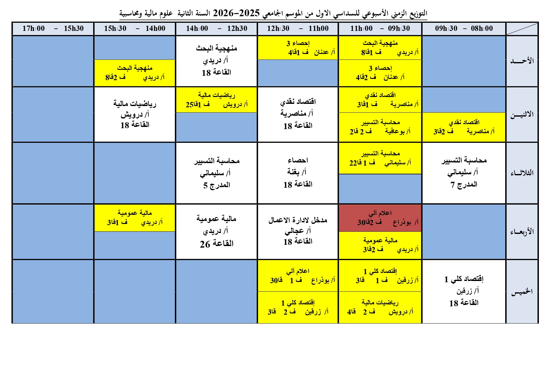 Emploi du temps hebdomadaire du premier semestre de l’année universitaire 2025–2026 – Deuxième année Sciences Financières et Comptables