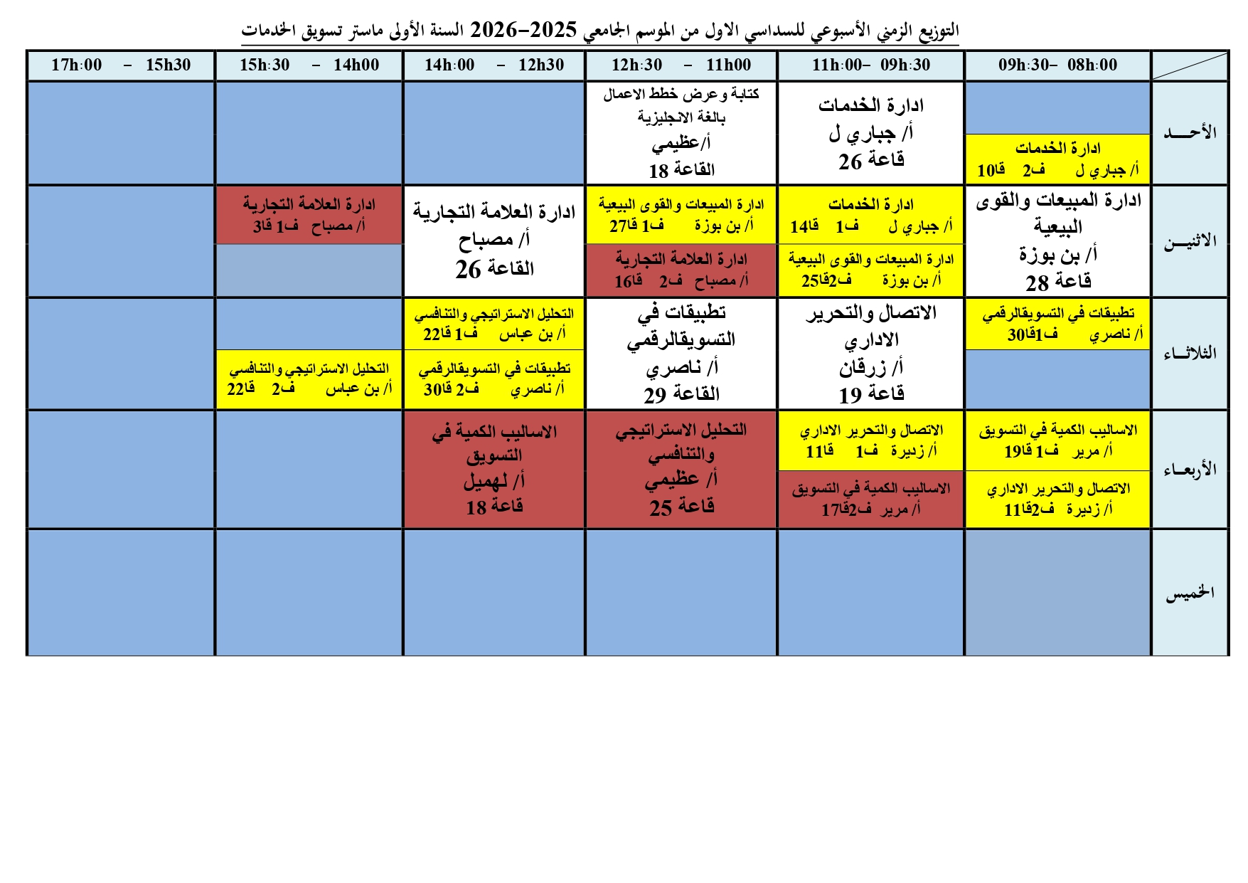 Emploi du temps hebdomadaire du premier semestre de l’année universitaire 2025–2026 – Première année Master Marketing des Services