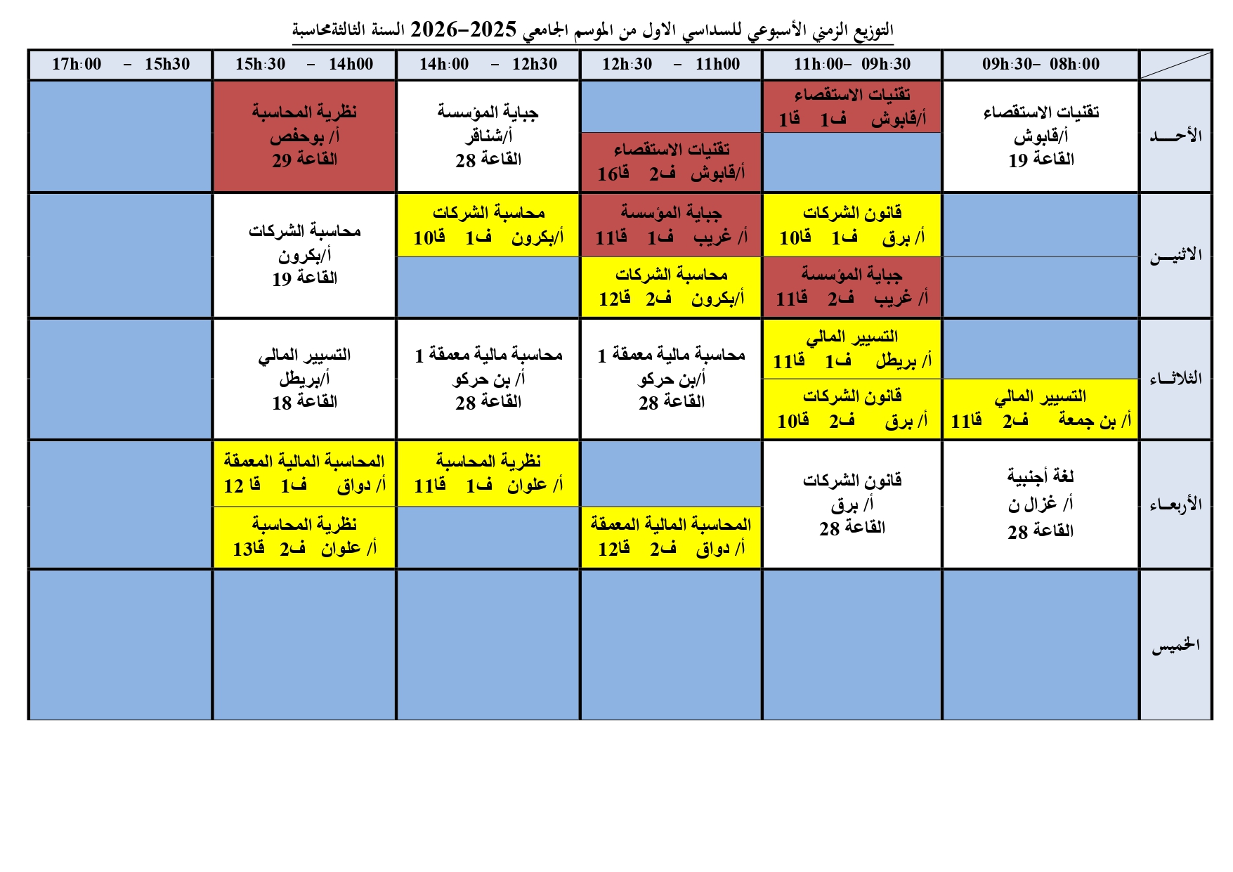 Emploi du temps hebdomadaire du premier semestre de l’année universitaire 2025–2026 – Troisième année Comptabilité