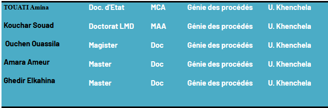 Dans ce contexte, le but de cette équipe de recherche est l’étude et le développement de nouveaux procédés efficaces d’oxydation et de séparation pour le traitement des effluents rejetés et la mise au point de nouvelles procédures efficientes de traitement des eaux à potabiliser.