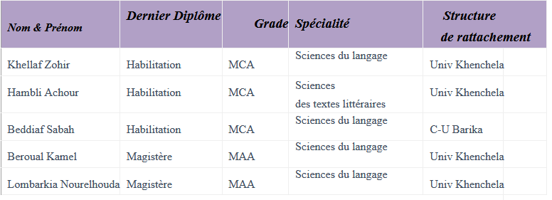Les Langues en Milieux Professionnels , dirigée par le Dr. KHELLAF Zoheir .Cette quatrième équipe du projet s’intéresse à la formation selon la demande sociale et économique ; elle s’intéresse aux travaux de recherche qui ciblent la construction d’une passerelle entre la formation universitaire, l’entreprenariat à l’université et le monde professionnel en assurant une mutation des compétences linguistiques plurilingues apprises à l’université et vers le milieu professionnel en plus de l’ouverture sur d’autres langues dans les recherches, via un amalgame linguistique. Les recherches se versant dans cette équipe sont celles qui s’articulent autour de la collaboration de la formation aussi bien des étudiants que des chercheurs selon les besoins bien précis du marché économique; des besoins sociaux et tout en prenant en compte l’environnement. Aussi les travaux abordant le remaniement de la tache d’apprentissage dans le but de la faire concorder avec les besoins extérieurs rentrent dans les axes de cette équipe.
