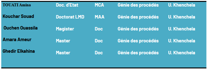 Dans ce contexte, le but de cette équipe de recherche est l’étude et le développement de nouveaux procédés efficaces d’oxydation et de séparation pour le traitement des effluents rejetés et la mise au point de nouvelles procédures efficientes de traitement des eaux à potabiliser.