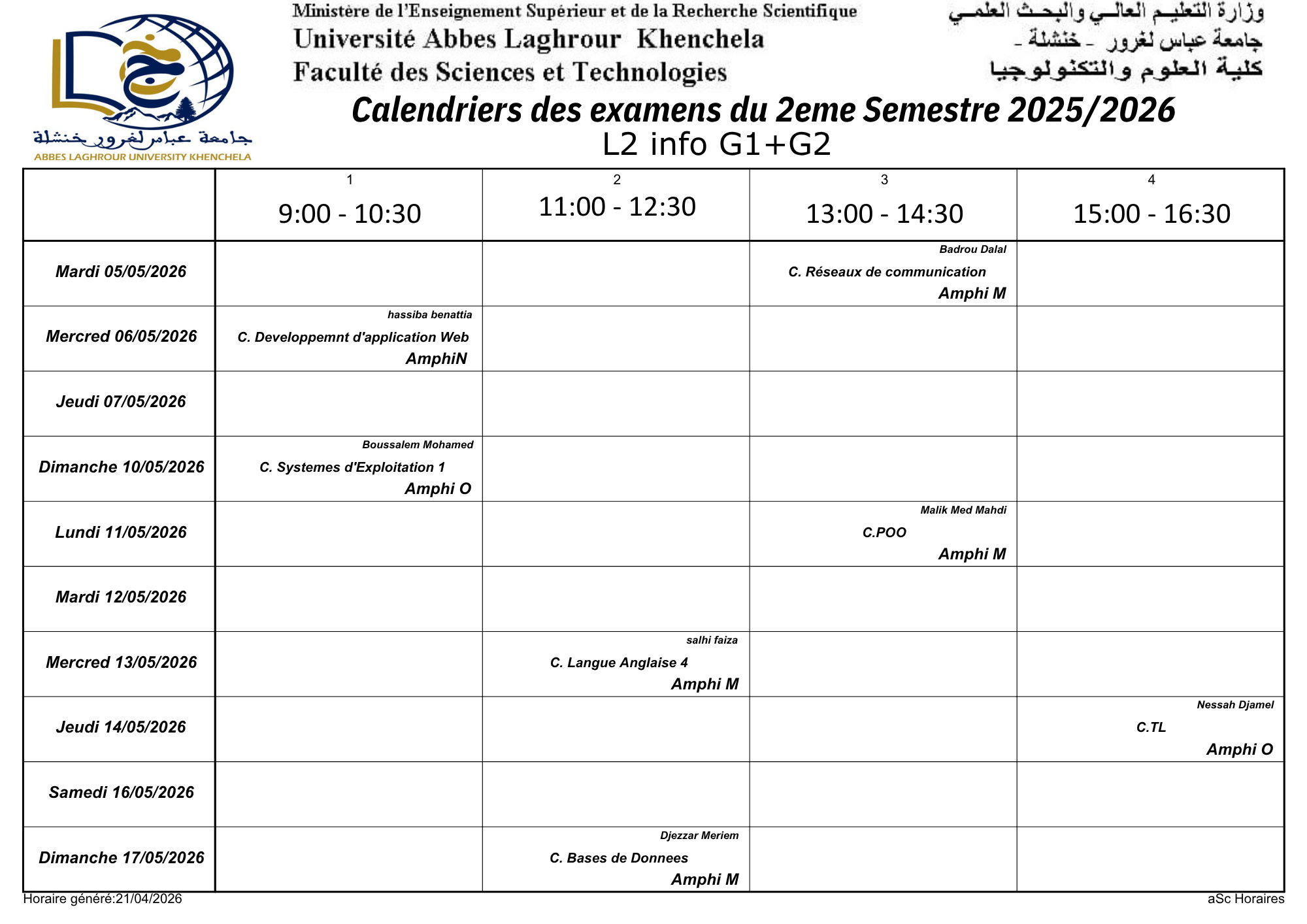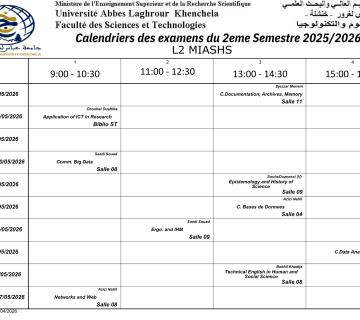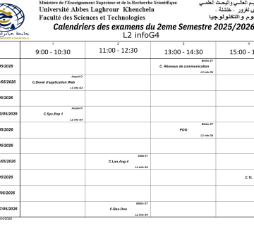 Calendrier des examens du département d'informatique -L2