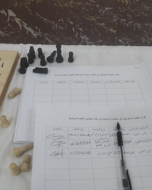 Dans le cadre de l’enracinement des valeurs du sport au sein du milieu universitaire, la Faculté de Droit et des Sciences Politiques annonce l’organisation de Journées Portes Ouvertes pour les Sports Universitaires, au profit des étudiants, nouveaux et anciens. Date : À partir du 28/09/2025Lieu : Hall de la Faculté de Droit et des Sciences Politiques. Le programme comprend : La présentation des activités sportives disponibles au niveau de la faculté et de l’université. L’inscription aux différents sports (collectifs et individuels). L’invitation est générale pour tous les étudiants de la faculté. ... اقرأ أكثر