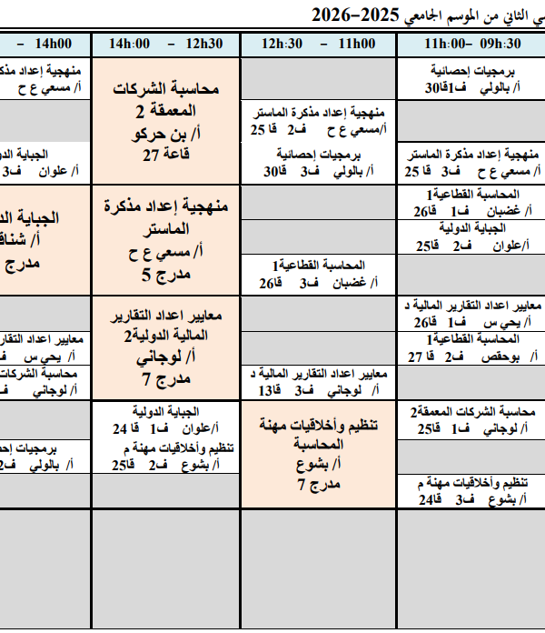 Emploi du temps hebdomadaire du deuxième semestre de l’année universitaire 2025-2026, première année de master en comptabilitéكلية العلوم الاقتصادية, التجارية و علوم التسيير2026-01-22