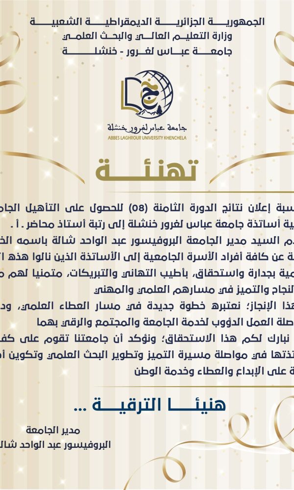 Nous adressons tous nos remerciements, notre respect et notre reconnaissance au président de l’université, le professeur #Abdelwahid_Shala, pour ses précieux efforts et sa contribution remarquable au service de l’université et à son rayonnement. Bonne année ! ✨Je vous souhaite de continuer à briller et à exceller, et de continuer à être une source de leadership et d’inspiration.✨ ... اقرأ أكثر