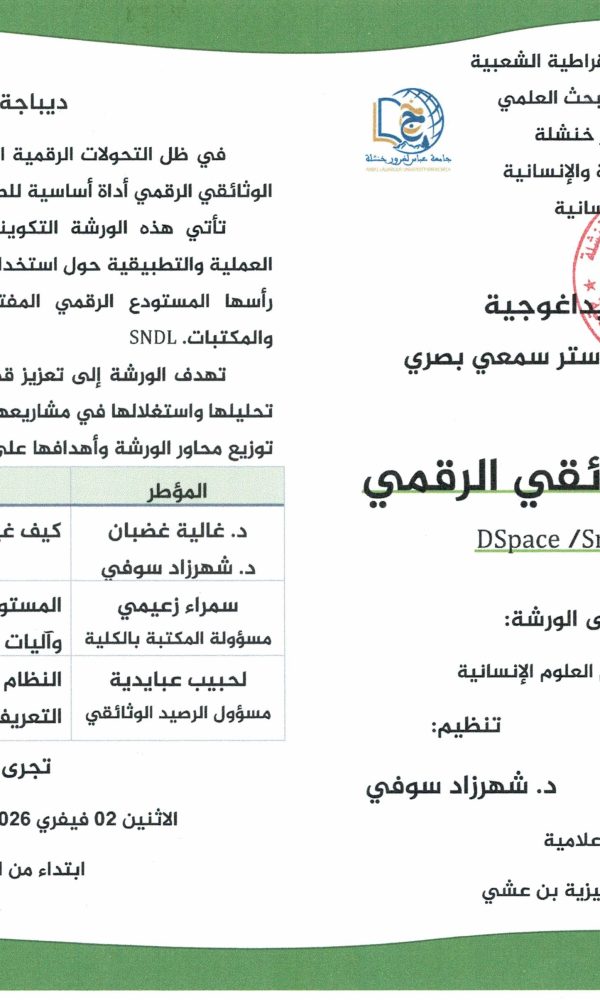Une délégation de l’Université Abbas Laghrour de Khenchela, par l’intermédiaire de sa Faculté des sciences sociales et humaines, sous l’égide du recteur de l’université, le professeur Abdelwahed Challa, et conduite par le doyen de la faculté, le docteur Boubekeur Benamrane, a effectué une visite scientifique à l’Université de Nouakchott, en Mauritanie. Elle a été reçue par le président de l’Université de Nouakchott et son équipe administrative. Cette visite, qui s’est déroulée du 9 au 11 décembre 2025, visait à renforcer la coopération internationale et à favoriser l’échange d’expertise entre les deux universités, notamment dans les domaines de l’assurance qualité, de la gouvernance, de l’intelligence artificielle, de l’entrepreneuriat dans l’éducation et du rôle de l’université dans le développement. ... اقرأ أكثر