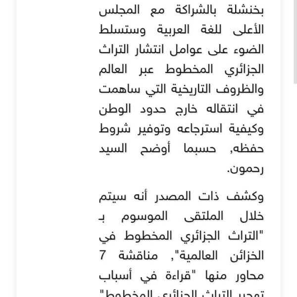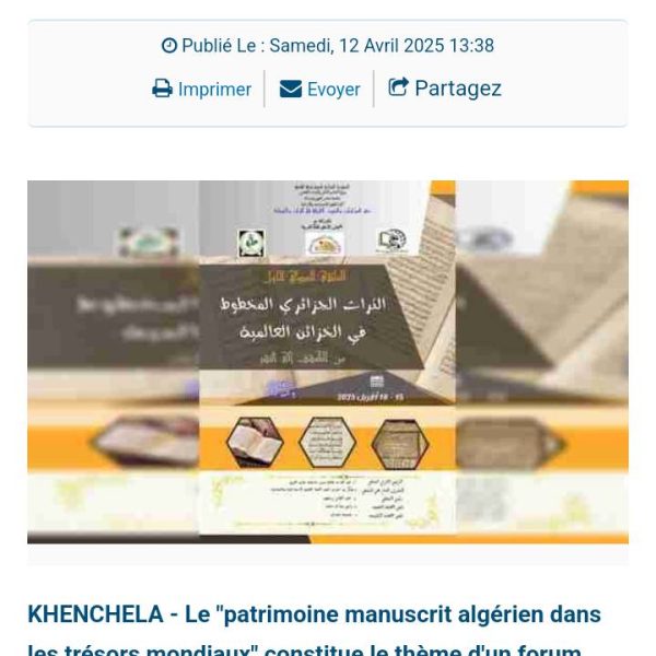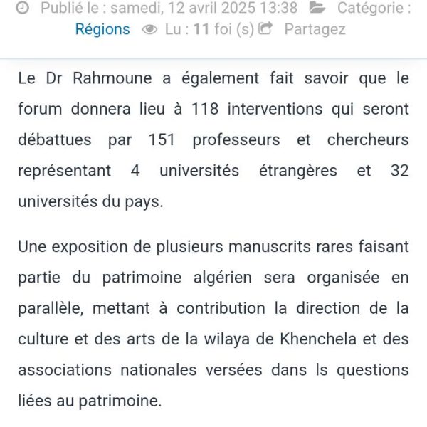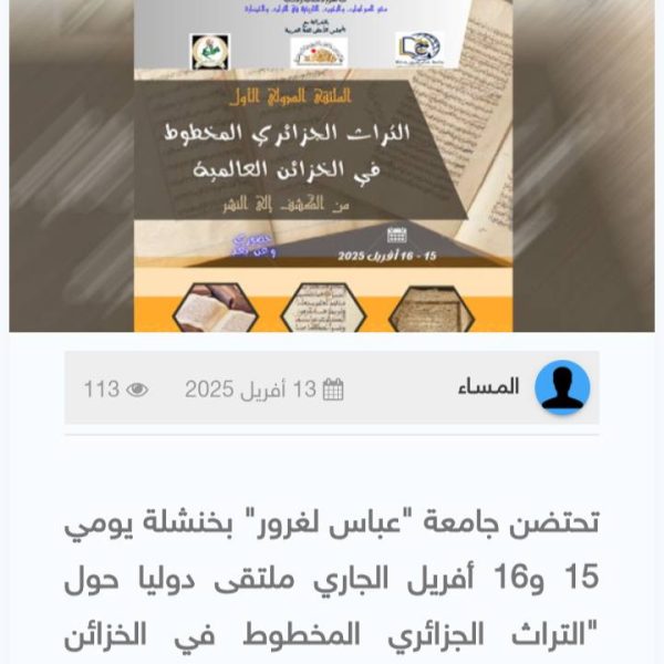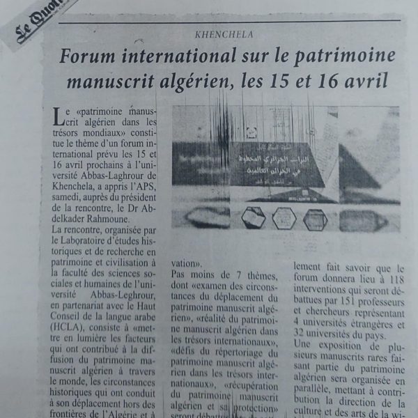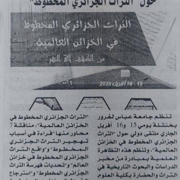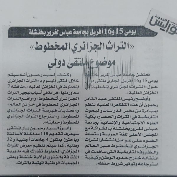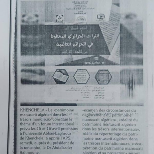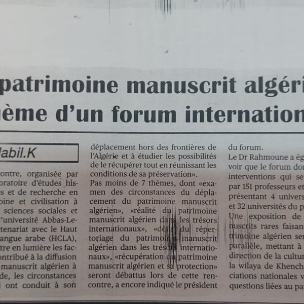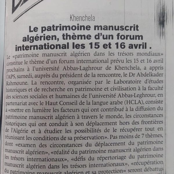 Une large couverture médiatique précède le lancement de la conférence internationale que l’Université Abbes Laghrour de Khenchela compte organiser sous le titre « Le patrimoine manuscrit algérien dans les archives mondiales – De la découverte à la publication », prévue du 15 au 16 avril 2025. Un groupe restreint de chercheurs et d’universitaires de l’intérieur et de l’extérieur du pays y participera.