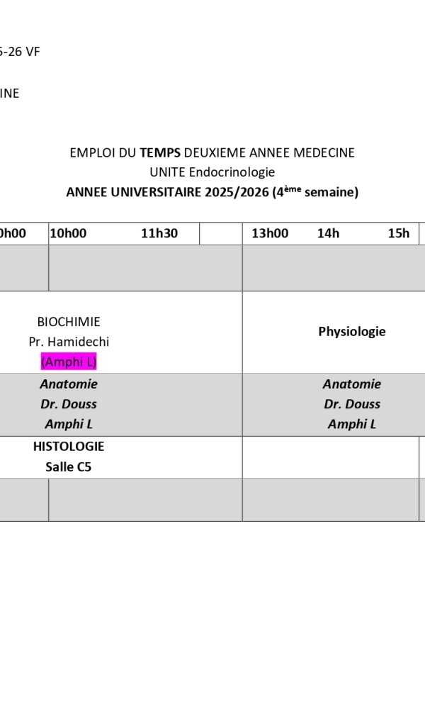 جدول التوقيت للسنة الثانية طب – وحدة الغدد الصماء