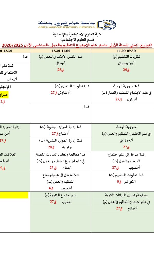 توزيع-زمني-قسم العلوم الاجتماعية-M1 علم الاجتماع التنظيم و العملكلية العلوم الاجتماعية والإنسانية2025-10-08