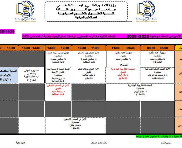 التوقيت الاسبوعي علوم سياسية 2 ماستر – دراسات أمنية و إستراتيجية –كلية الحقوق والعلوم السياسية2025-10-07