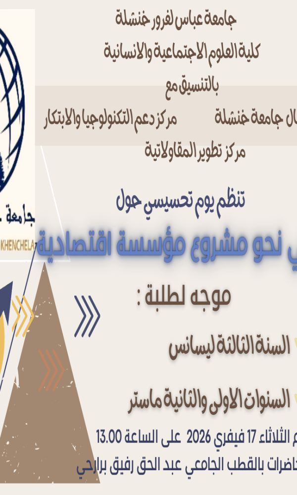 ليكن في علم جميع الطلبة أنه تم وضع نماذج أسئلة الامتحانات السابقة مرفقة بالإجابات النموذجية في المستودع الرقمي منصة DSpace كما نعلمكم أن الإجابات النموذجية للامتحانات الحالية سيتم نشرها تباعا على نفس المنصة، قصد تمكين الطلبة من الاطلاع عليها والاستفادة منها. ندعو جميع الطلبة إلى متابعة المستودع الرقمي والاطلاع على المحتوى المتوفر. عبر الرابط التالي: http://dspace.univ-khenchela.dz:4000/communities/41adcedc-1880-4959-be0f-c8b9c06febbb ... اقرأ أكثر