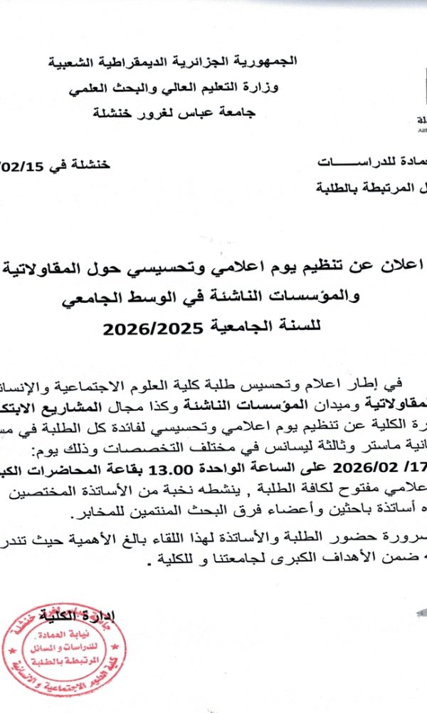 طلبة السنة الثانية ماستر سمعي بصري المادة مخبر السمعي البصري الأربعاء 10 ديسمبر 2025. التوقيت من 14:00 الى 15:30 المدرج 3 الاستاذة د. شهرزاد سوفي ... اقرأ أكثر