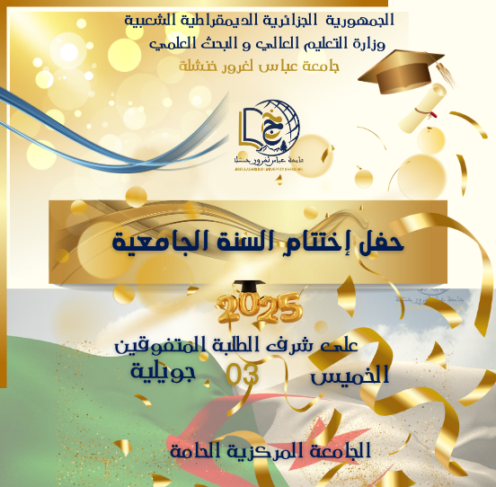 حفل اختتام السنة الجامعية 2024-2025 بجامعة عباس لغرور – الخميس 03 جويلية 2025 تتشرف رئاسة جامعة عباس لغرور بدعوة كافة أعضاء المجتمع الجامعي والجمهور العام لحضور الحفل الرسمي لتكريم الطلبة المتفوقين أكاديمياً، والذي سيقام: 📅 التاريخ: الخميس 03 جويلية 2025 🕒 الوقت: (الساعة السابعة مساءا ) 🏛️ المقر: الجامعة المركزية – الحامة تكريم الطلبة الأوائل في جميع التخصصات. عرض إنجازات البحث العلمي البارزة خلال العام. كلمة رئيس الجامعة حول مسيرة التميز الأكاديمي. توزيع الجوائز التشجيعية والمنح الدراسية. الحضور الهيئة التدريسية والإدارية. الطلبة والخريجون. وسائل الإعلام المهتمة بالشأن التعليمي. “هذه المناسبة تمثل تتويجاً لجهود عامٍ من الإبداع المعرفي، وتؤكد التزام جامعتنا برعاية الكفاءات العلمية الواعدة.“ ... اقرأ أكثر